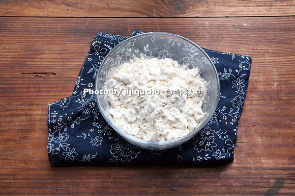 将面粉放入盆中,慢慢的倒入70°左右的水,边倒边用筷子将面粉搅成絮状。