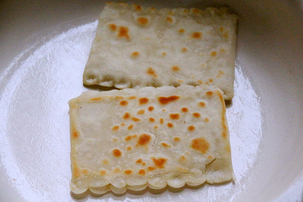翻面后再刷少许的油,烙至两面上色,中间高高鼓起即可。