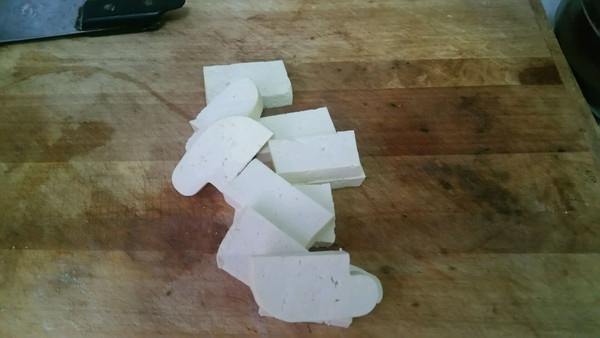豆腐切片还是块儿来着。也不知道到底属于啥豆腐。说嫩吧摸着也不嫩。说老吧放锅里也会烂