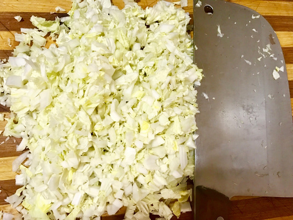 白菜细细剁碎,用纱布包裹起来用力扭去些水份。有些比较干的菜不一定能挤出来水,挤一下也是起到让菜碎变软的作用。