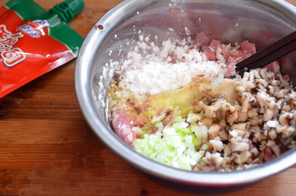 搅拌至水分全部被猪肉吸收,继续搅拌至上劲,搅拌好的肉馅放冰箱冷藏1-2个小时。