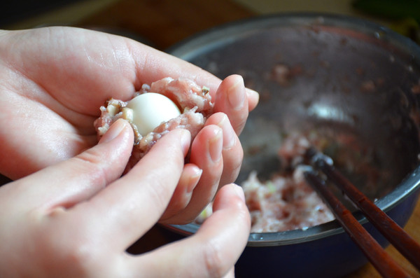 双手沾水,取适量肉泥压扁,加入鹌鹑蛋,包裹住,在两个手心来回交换整形成圆形。