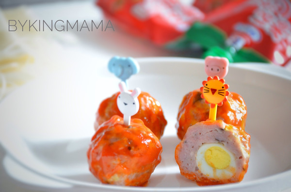 除鹌鹑蛋,味好美番茄沙司,蛋黄液以外其他配料、调料加入肉馅里。