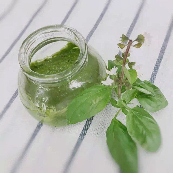 青酱制作过程:松子小火烤香 一小碗罗勒叶、适量羽衣甘蓝、2汤匙芝士粉、4瓣蒜、1茶匙芝士粉、2汤匙橄榄油、1袋大麦青苗粉、少许盐和黑胡椒,放入搅拌机内,搅拌至泥状,盛出