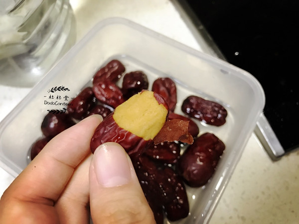 满满的一杯枣肉,然后把放进开水,不要用煮枣子的水。千滚水毕竟不好,容易上火。