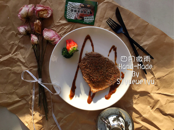 摆盘,将黑胡椒酱淋在素盘内,装饰上西兰花,草莓。