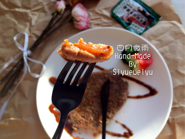 牛排两面淋上红酒涂抹薄薄的一层黄油,抹上托斯卡纳牛排料。