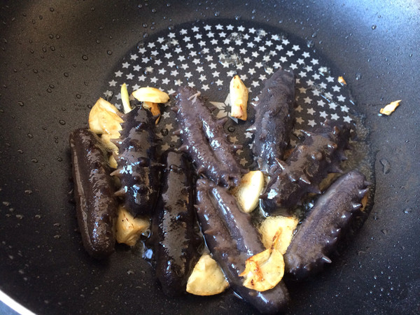 锅内加少许色拉油,放入蒜片爆香再下去海参。