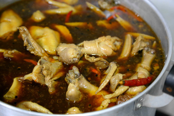 卤水焖好之后我们现在就开始来卤制了,一般来说我们要先放不容易熟的,我最先放了猪蹄儿煮二十分钟左右 接着就是放入鸭脚,这个玩意儿还真不容易熟