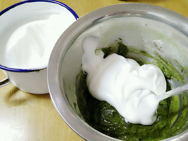 现在开始混合蛋白霜和面糊,分蛋白霜三分之一在面糊里,翻拌均匀后再加入剩下的也是分三次放完。