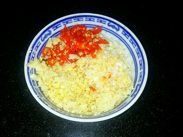 油热后加入姜、蒜、辣椒,炒香后再将盐菜炒匀。
