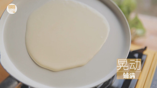 准备一个平底锅,倒入面糊,晃动锅子让面糊摊匀铺满