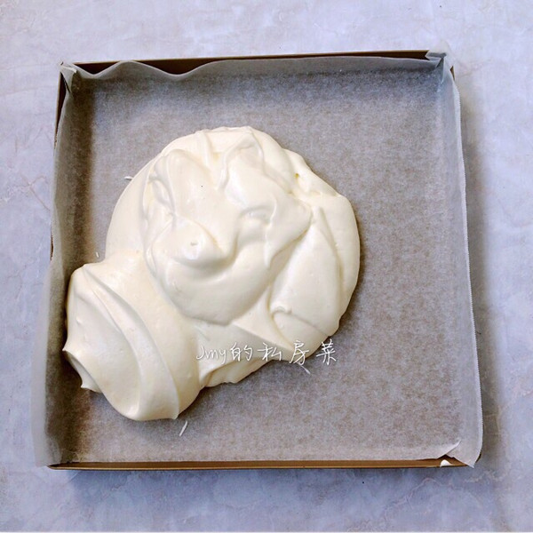 准备一个烤盘,我用的是28x28的方盘 ,垫上油纸,这样脱模方便,把蛋糊倒入烤盘内。