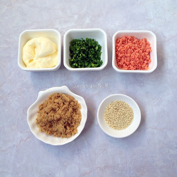 香葱与火腿肠切碎,这是用来放在蛋糕表面的,沙拉用来涂抹在切好的蛋糕卷上面,然后沾上肉松,等会要用到。