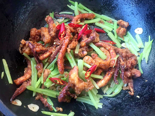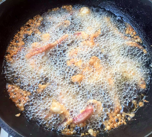 锅中倒入适量油加热至7-8成放入鱿鱼须大火炸至金黄色