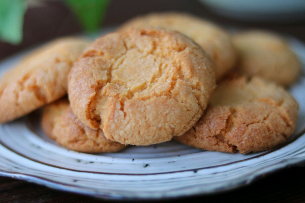 烘烤十分钟后,快速拿出来,用刮刀头在桃酥表面戳个坑。