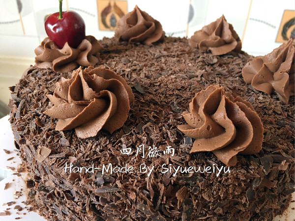 表面装饰,挤上巧克力奶油,装饰上黑樱桃。