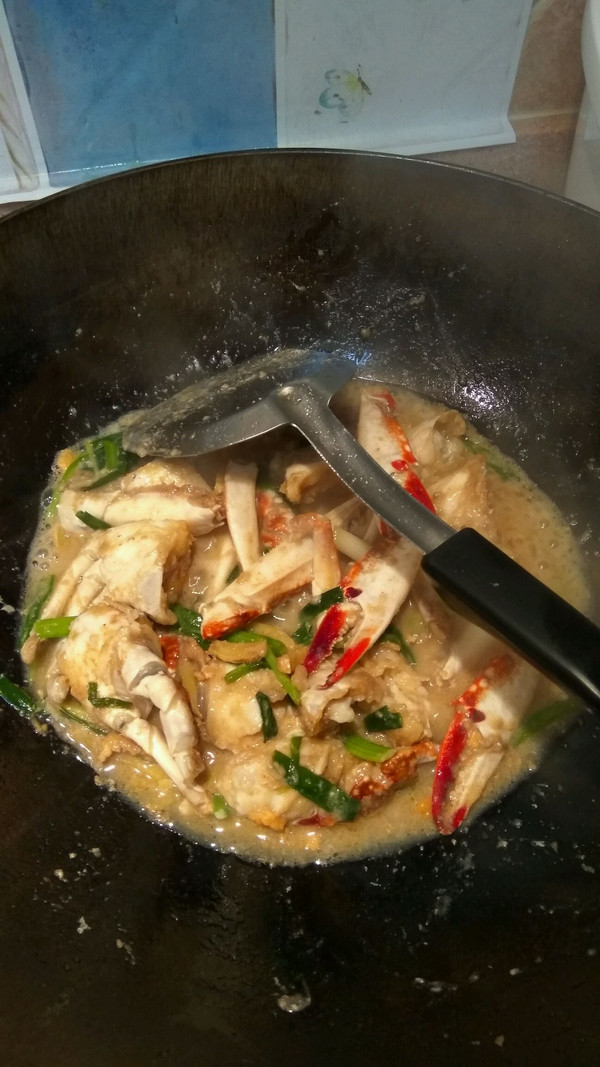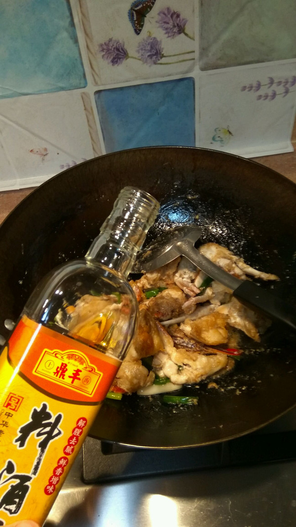 加入螃蟹块炒匀,再倒入料酒