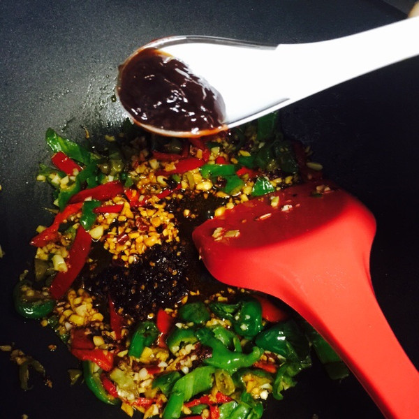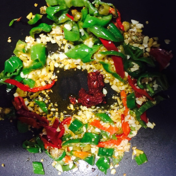 我喜欢先炒辣椒生姜出香味后再放大蒜,因为大蒜炒久了容易变黄黑色。