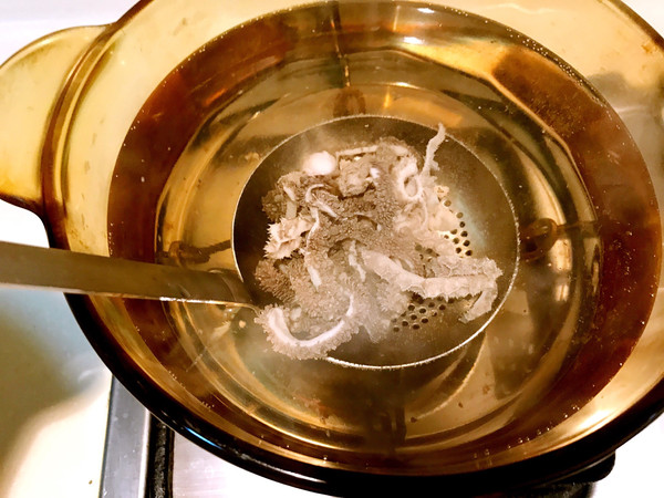 捞去葱姜花椒,下一个滤勺,每次加一到二两,我这个有点小,一次加了一两,下水后数八秒,迅速捞出控水,这就行了,才能有脆嫩的口感,再久就硬的嚼不动了。