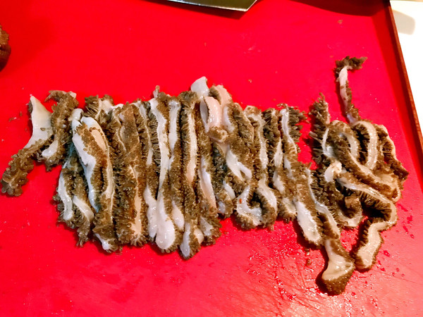 分别切好,爆肚各部位名称烫法不同,我也没老分得清楚,基本如图,颜色越浅的越薄越嫩。