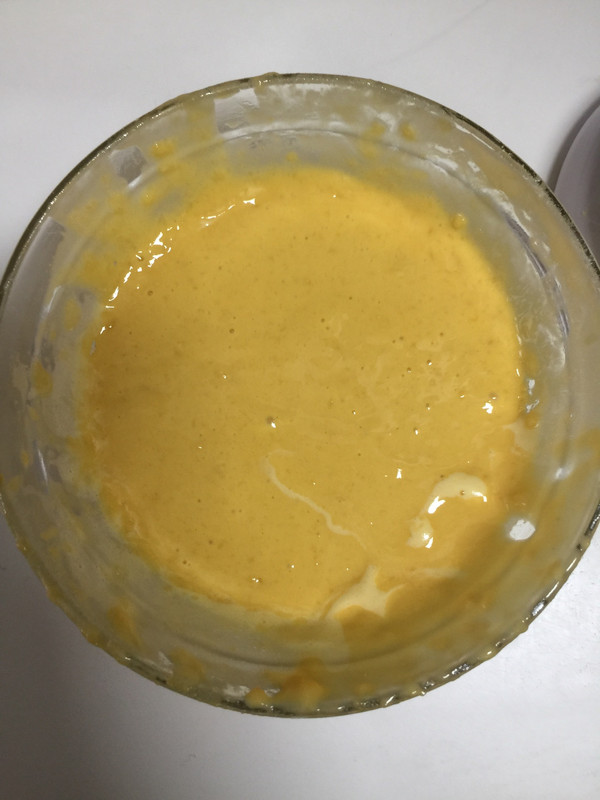 食材准备好后,第一步先用打蛋器把蛋搅拌均匀,搅拌均匀后,分三次加入糖,第一次加入三分之一搅拌至发白,第二次加入糖搅拌至粘稠,第三次加入糖后,搅拌至蛋液滴下来的时候不能很快滴落为止如下图