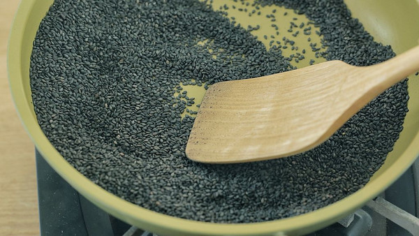 怎么判断炒熟没有呢?炒至黑芝麻能够用手捏碎的程度,就是熟了。另外,炒好的芝麻要放凉后才能进行下一步操作,不然里面会夹杂水汽,打出来的粉容易结成团。