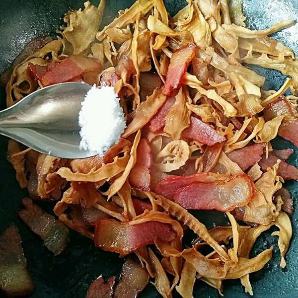 煸炒至腊肉肥肉部分变的透明微微卷起时放入发泡好的笋干翻炒片刻,让笋干沾满腊肉的香味。
