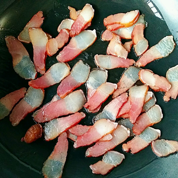 锅中少量油(一定要少,腊肉煸炒时还会出油的),烧至7成热,放进切好的腊肉煸炒。