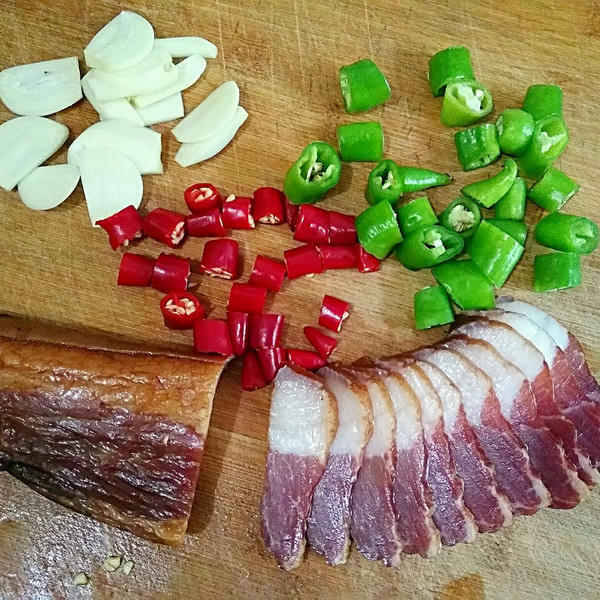 腊肉洗净切薄片;杭椒,小米辣切段;蒜切片备用。