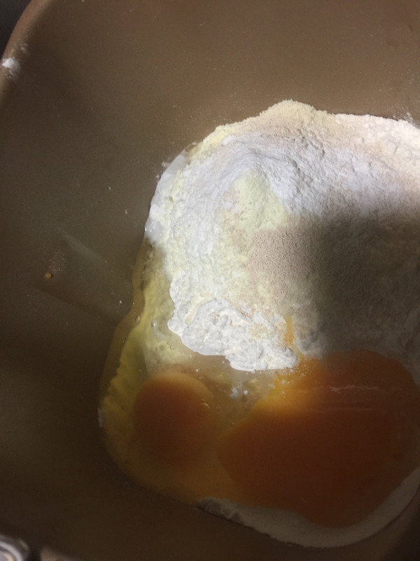 面粉,奶粉,鸡蛋,白糖,酵母一起放面包机搅拌。