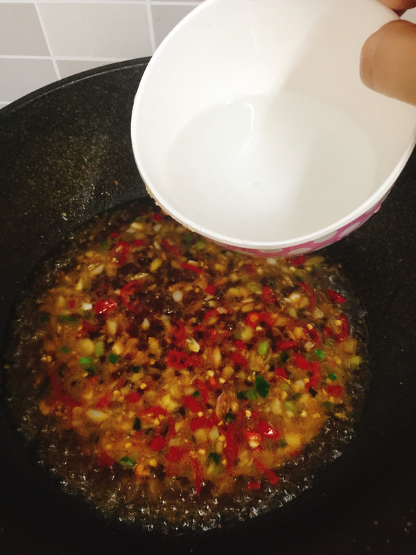 锅里留少许油,加入辣椒、葱姜蒜末一起炒出香味