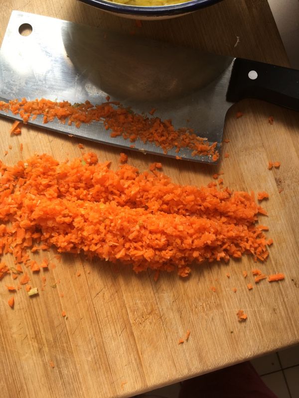 剁细晾凉的同时切韭菜,宝宝吃,越细越好