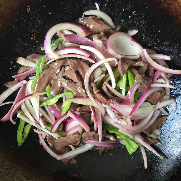 牛心炒熟后倒入洋葱、辣椒继续大火爆炒。