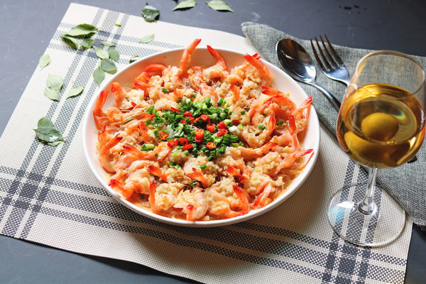 蒸好的蒜蓉粉丝虾,撒上葱花和红椒圈,浇上热油即可