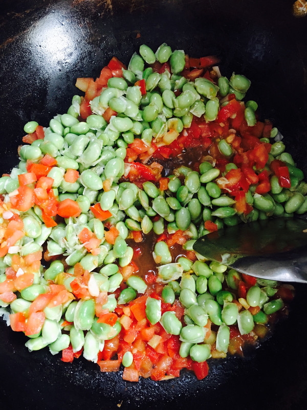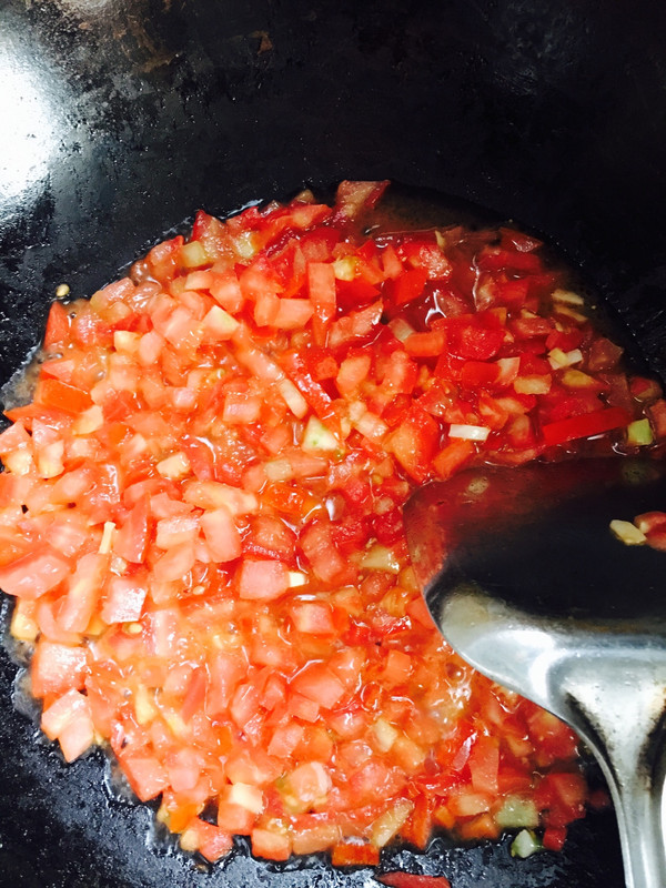 锅里放少许油,放姜蒜爆香,倒入蕃茄炒出汁