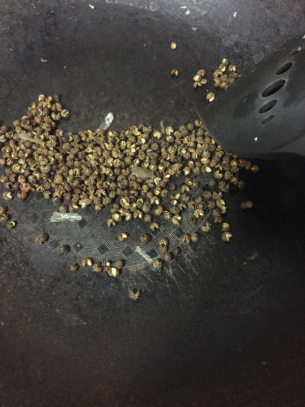 等和面的时候也不用闲着、小火炒花椒、出香味并颜色由绿变微红就可以出炉。
