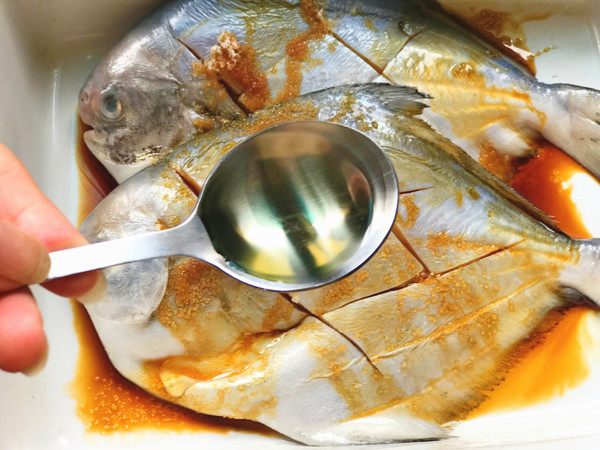 放上腌制后鲳鱼,鲳鱼上刷一层色拉油