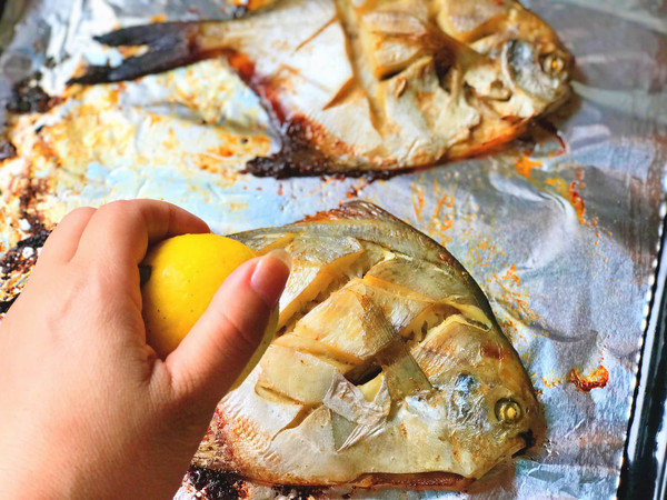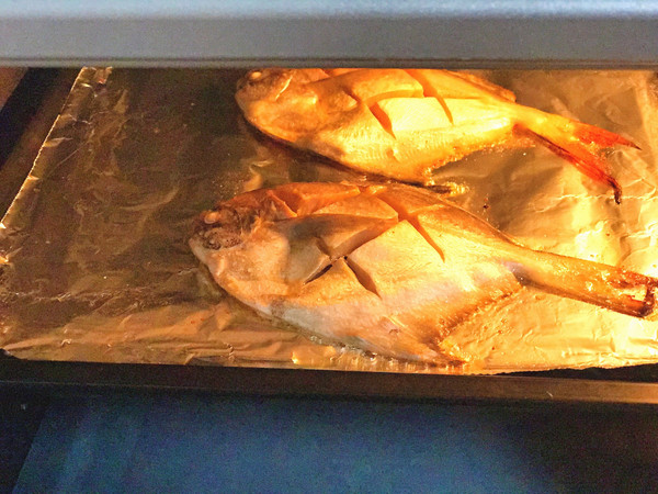 烘烤20分钟后,鲳鱼翻一面,再烘烤15分钟即可