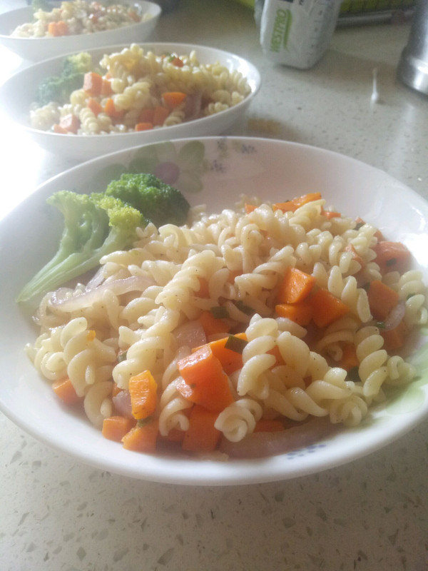 洋葱切丝,胡萝卜切丁后用水加入盐煮熟,西兰花烫熟后备用。