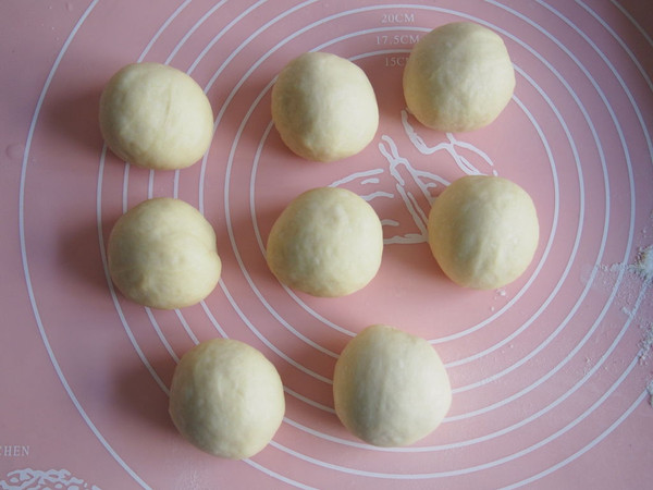 用刮板将面团分成9等份,中间不要切断,将切开的部分依次朝上反过来,压扁。