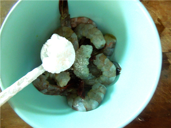 虾去头去壳留尾,放在小碗里加半小勺盐