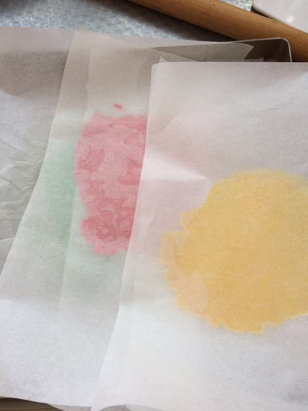 用面杖隔油纸擀成1mm 左右的薄片,放冰箱冷冻5分钟左右至稍硬,备用