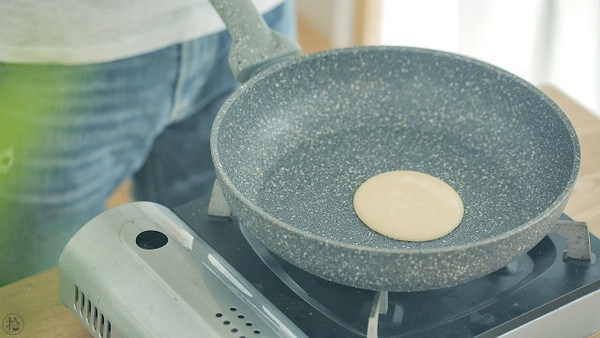 平底锅起小火,稍稍加热后倒入一小勺面糊,摊成小圆饼。