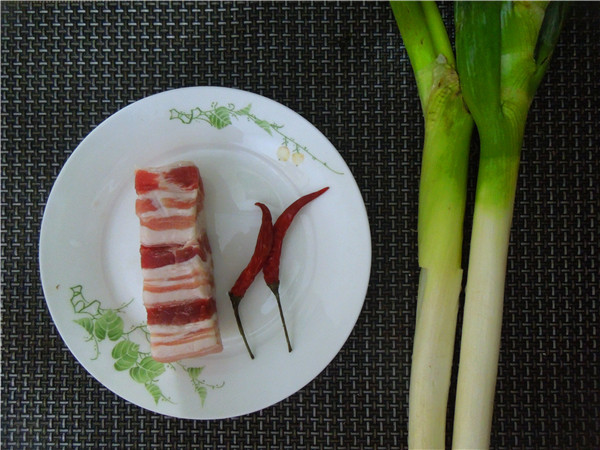 五花肉在锅里煮透,立即捞出在水里冲凉一下,切片