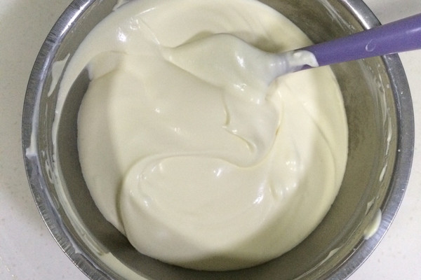 取1/3蛋白糊加入蛋黄液中,用刮刀翻拌均匀。