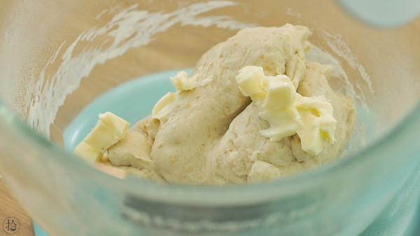 加入20g软化好的黄油,继续揉面。
