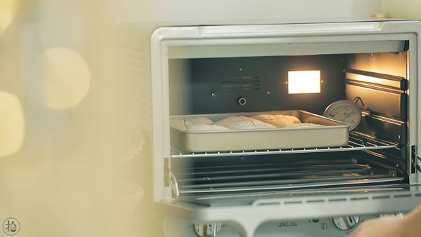放入烤箱或其他密闭容器里静置发酵至1.5倍大。 入烤箱最后发酵的时候,我只在下面放一盘热水,不开烤箱发酵。