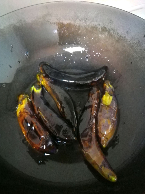 煎辣椒,油要比炒菜多一点,两面煎变色,