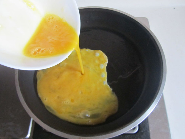 热锅凉油, 倒入鸡蛋液;